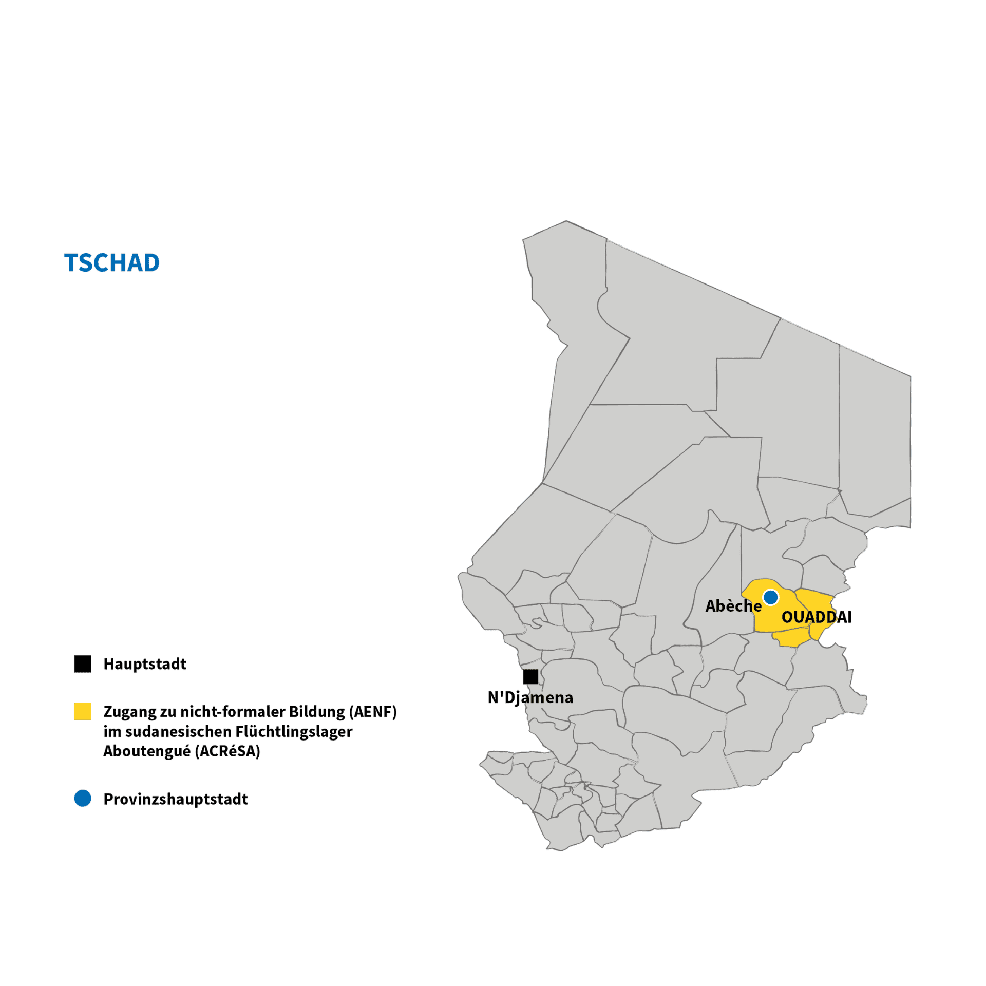 Das Flüchtlingslager Aboutengué in der Provinz Ouaddaï liegt etwa 50 km von der sudanesischen Grenze entfernt in einer sicheren Zone. Derzeit sind 60 % der Kinder ohne Schulbildung, was ihre Zukunft und die ihrer Gemeinschaft ernsthaft gefährdet.